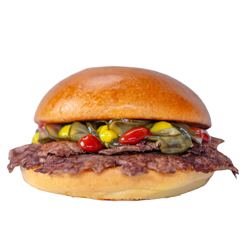Um macio pão brioche, levemente tostado para ganhar textura. Dois smash patties premium de 160g, suculentos e bem dourados na chapa, acompanhados por pickles crocantes e o equilíbrio clássico de mostarda e ketchup.