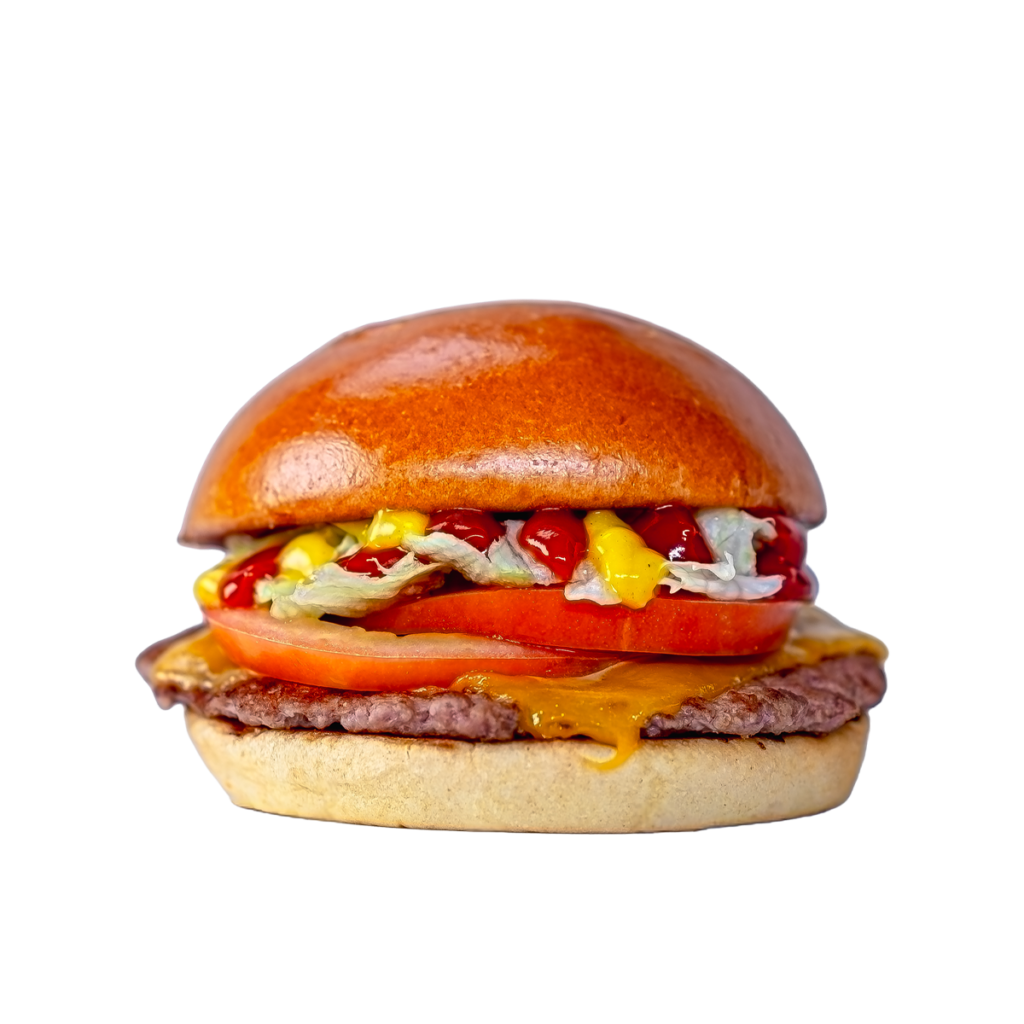 Pão brioche tostado no ponto certo a envolver um hambúrguer premium de 160g grelhado na perfeição. Junta-se tomate maduro, alface fresca e queijo americano derretido, finalizado com mostarda e maionese.