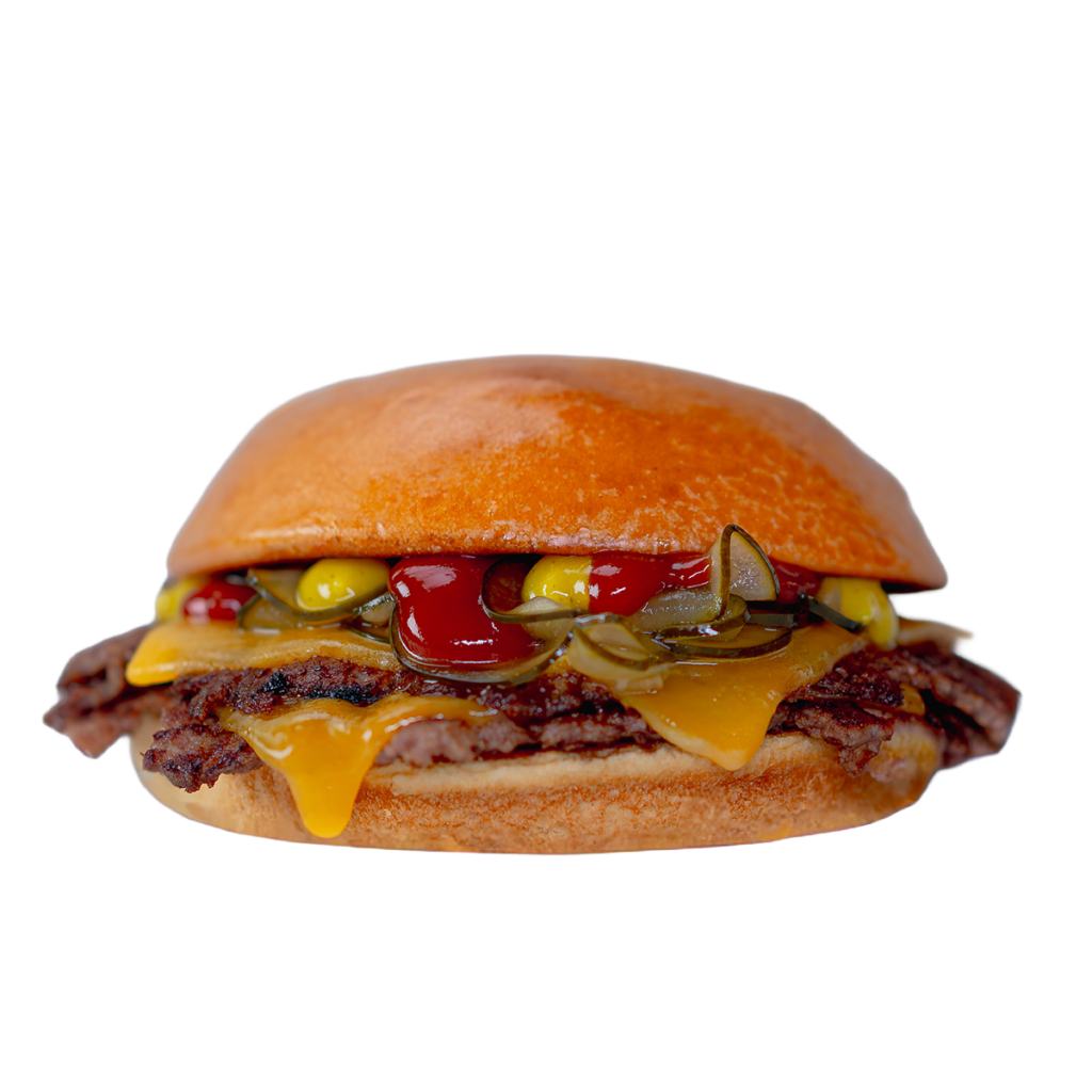 Pão brioche quente e amanteigado, dois smash patties premium de 160g com crosta dourada e dupla camada de queijo americano bem derretido. Pickles crocantes, mostarda e ketchup.